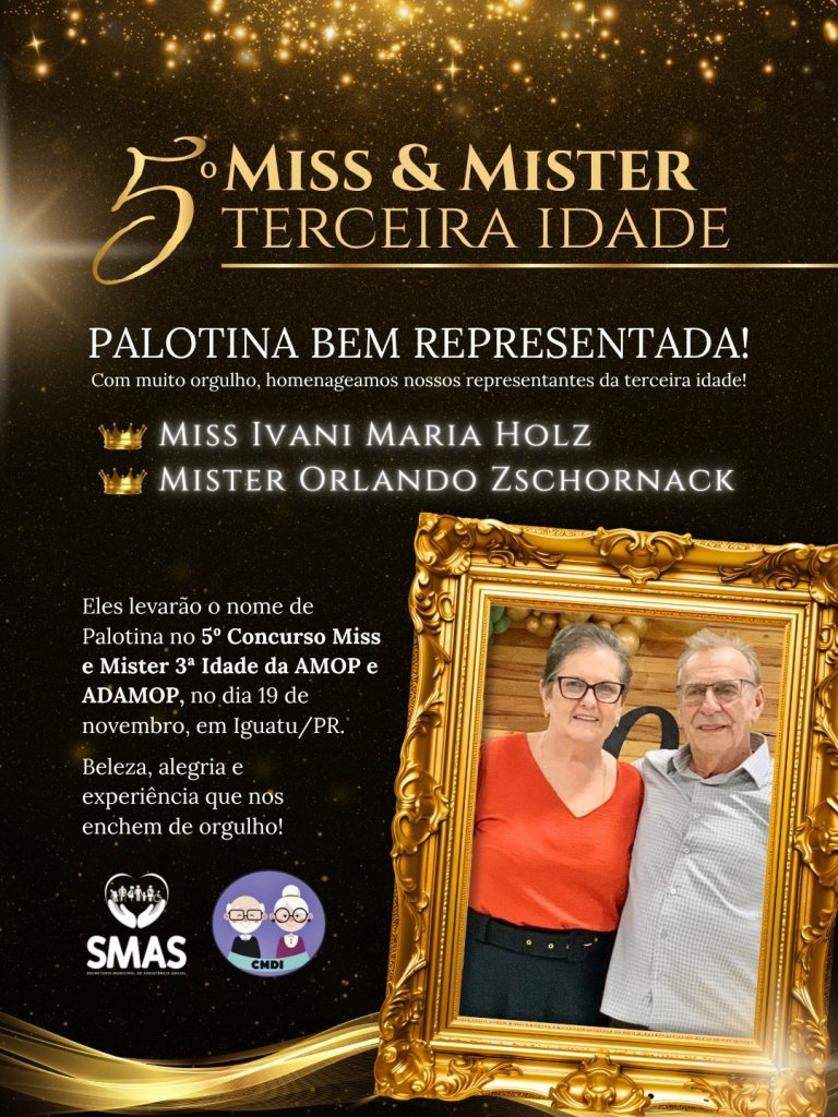 O município de Palotina será representado no 5º Concurso Miss e Mister 3ª Idade da AMOP e ADAMOP, que acontece nesta quarta-feira, dia 19, no Centro de Eventos João Posolini, no município de Iguatu. Representam Palotina os candidatos Ivani Maria Holz (Miss) e Orlando Szchornack (Mister).