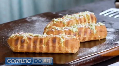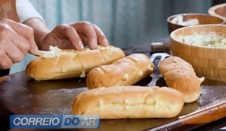 O recheio cremoso de maionese, manteiga, queijo parmesão, alho e ervas é generoso e intenso, transformando o pão em protagonista na grelha.