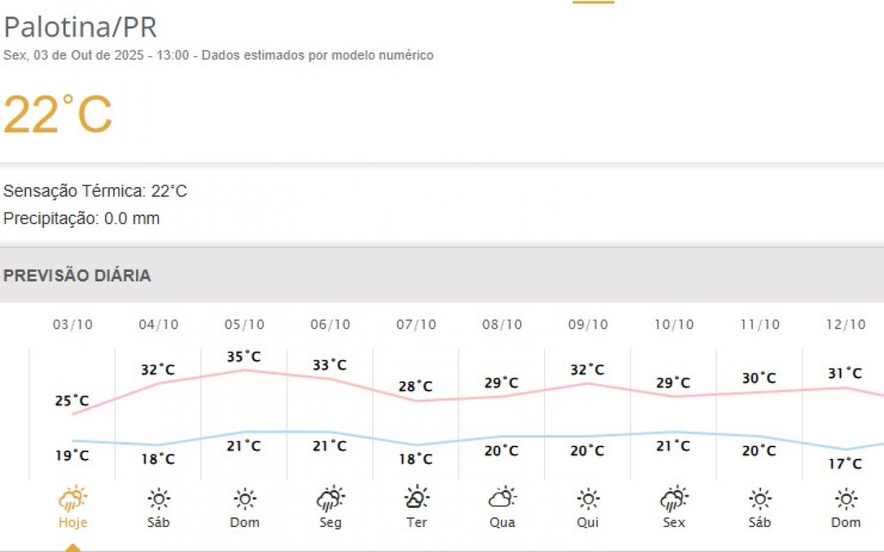 Palotina também sentirá os reflexos do forte aquecimento. A previsão aponta máximas em torno de 32°C no sábado e de até 35°C no domingo, com tardes abafadas e condição para pancadas de chuva isoladas a partir de segunda-feira.