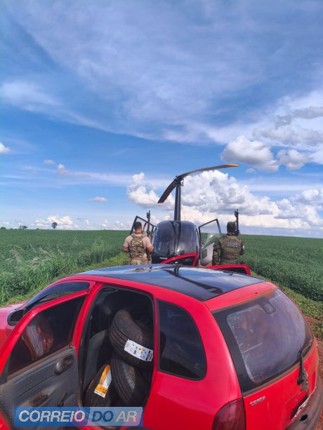 Nesta sexta-feira (16/01), equipes da Polícia Federal (NEPOM/PF), em colaboração com o Grupamento de Operações Aéreas (GOA) da Polícia Civil do Paraná e o Batalhão de Polícia de Fronteira (BPFRON) da Polícia Militar do Paraná, receberam denúncia anônima sobre um veículo GM Corsa, de cor vermelha, que estaria transportando produtos ilícitos na área rural de Guaíra/PR. Após patrulhamento pela região de poderia clandestinos, equipe integrada logrou êxito em localizar veículo saindo de Porto clandestino. Ao ser sinalizado para parar, o condutor desobedeceu e empreendeu fuga, abandonando o veículo carregado em uma área de mata fechada e evadindo-se a pé. No interior do carro, foram encontrados aproximadamente 52 pneus e uma caixa de cigarros, ambos de origem paraguaia. Posteriormente, um indivíduo foi abordado próximo ao local dos fatos e confessou que estava no veículo apreendido, acompanhado do condutor.
