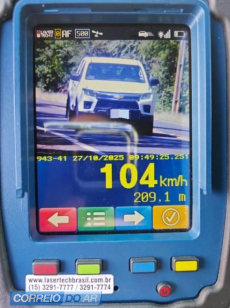 Durante a fiscalização, que ocorreu em condições de tempo bom, foi registrada a velocidade máxima de 104 km/h, sendo que o limite permitido nas vias fiscalizadas é de 80 km/h para veículos leves e pesados.