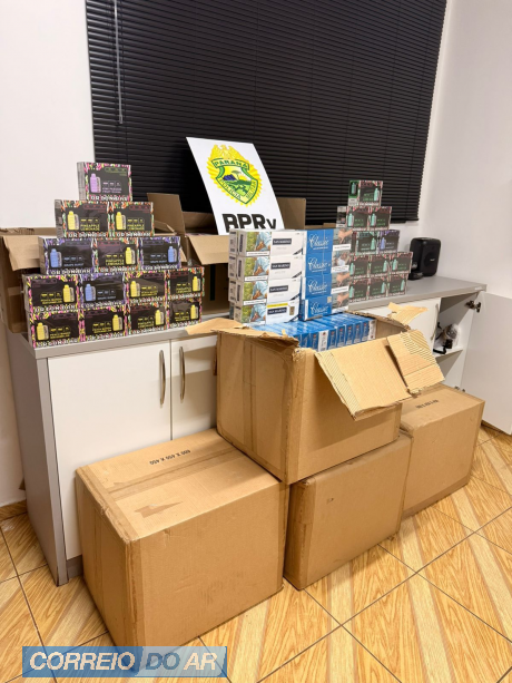 Em vistoria no bagageiro, em meio as encomendas, foram encontradas sete caixas com 790 pacotes de cigarros e 720 vapers. O contrabando foi encaminhado à Receita Federal de Cascavel. Estima-se em R$ 90 mil o prejuízo ao crime.