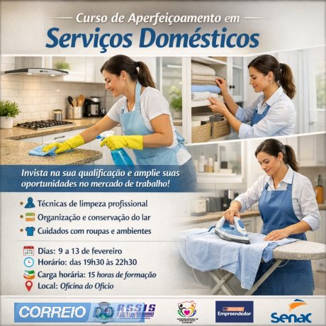 A Prefeitura de Assis Chateaubriand, por meio da Secretaria de Assistência Social e da Mulher, abriu inscrições para o Curso de Aperfeiçoamento em Serviços Domésticos. A capacitação será realizada na Oficina do Ofício, entre os dias 9 a 13 de fevereiro, das 19h30 às 22h30, totalizando 15 horas de formação.