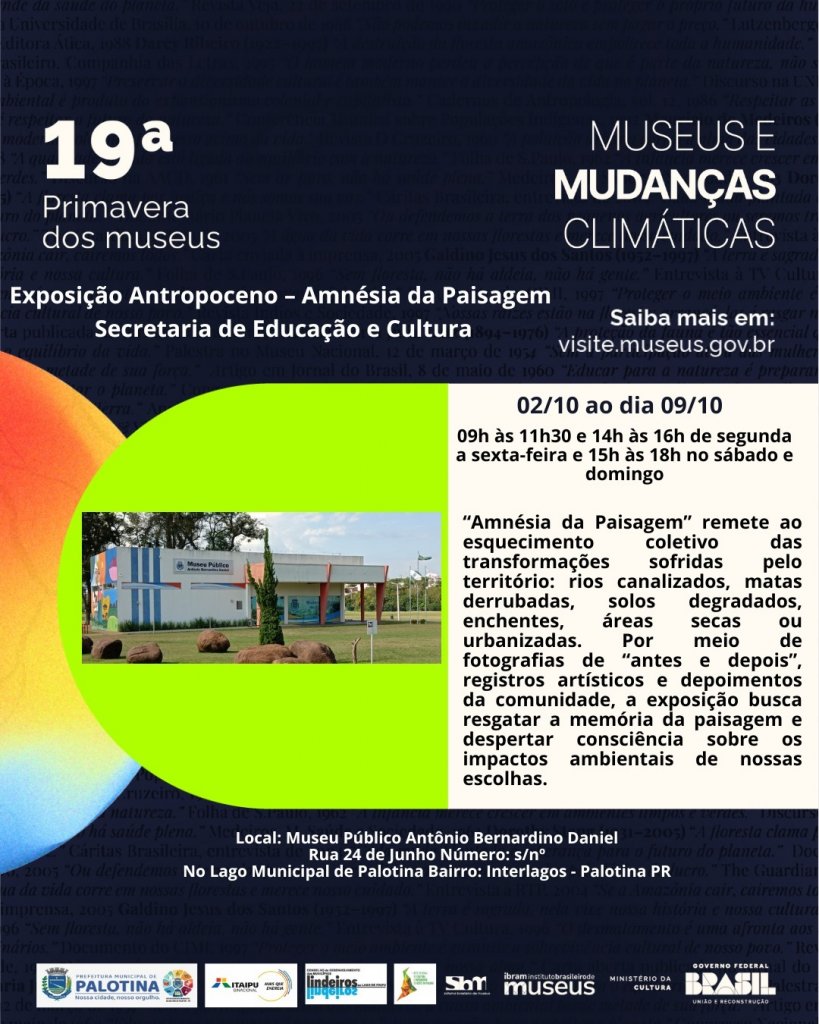Promovida pelo Instituto Brasileiro de Museus (IBRAM), a 19ª edição do evento tem como tema central “Museus, Educação e Pesquisa”, com foco em ações voltadas à crise climática e ao papel dos museus como agentes de transformação social e ambiental. A mostra conta com o apoio da Itaipu Binacional, por meio do Convênio Linha Ecológica dos Lindeiros, e da Administração Municipal de Palotina, através da Secretaria de Educação e Cultura.