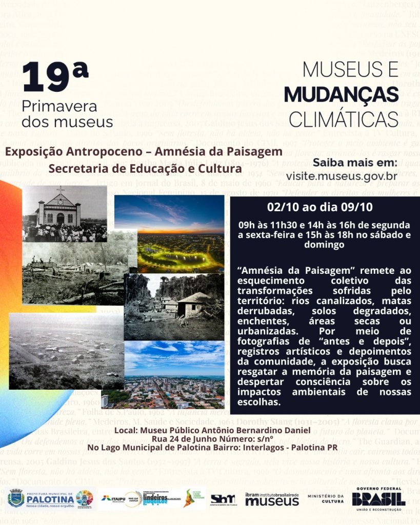 De 2 a 19 de outubro, o Museu Público Antônio Bernardino Daniel, localizado no Lago Municipal de Palotina, será sede da Mostra Itinerante de Fotografias “Antropoceno – Amnésia da Paisagem”, uma ação integrada à programação nacional da 19ª Primavera dos Museus.