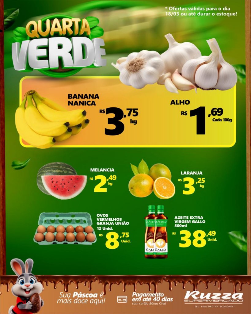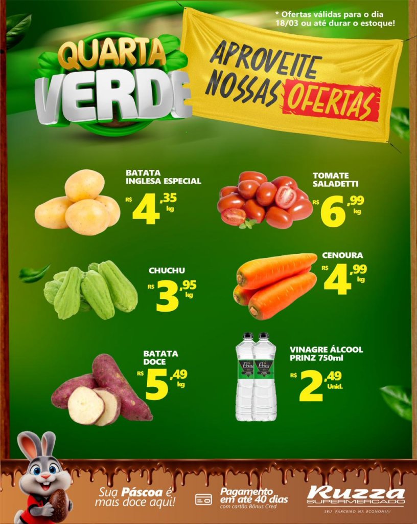 Nesta quarta-feira (18), o Supermercado Ruzza realiza mais uma edição da tradicional Quarta Verde — a oportunidade ideal para garantir frutas, verduras e legumes fresquinhos e selecionados.
