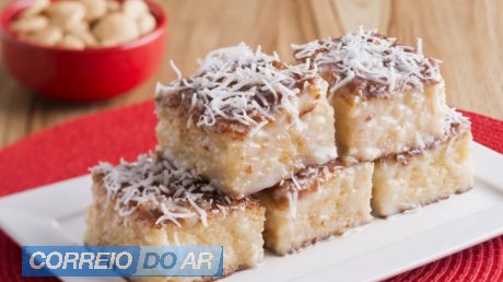 - Corte o bolo de coco em quadradinhos. Banhe na caldinha de coco e polvilhe coco seco. Sirva.