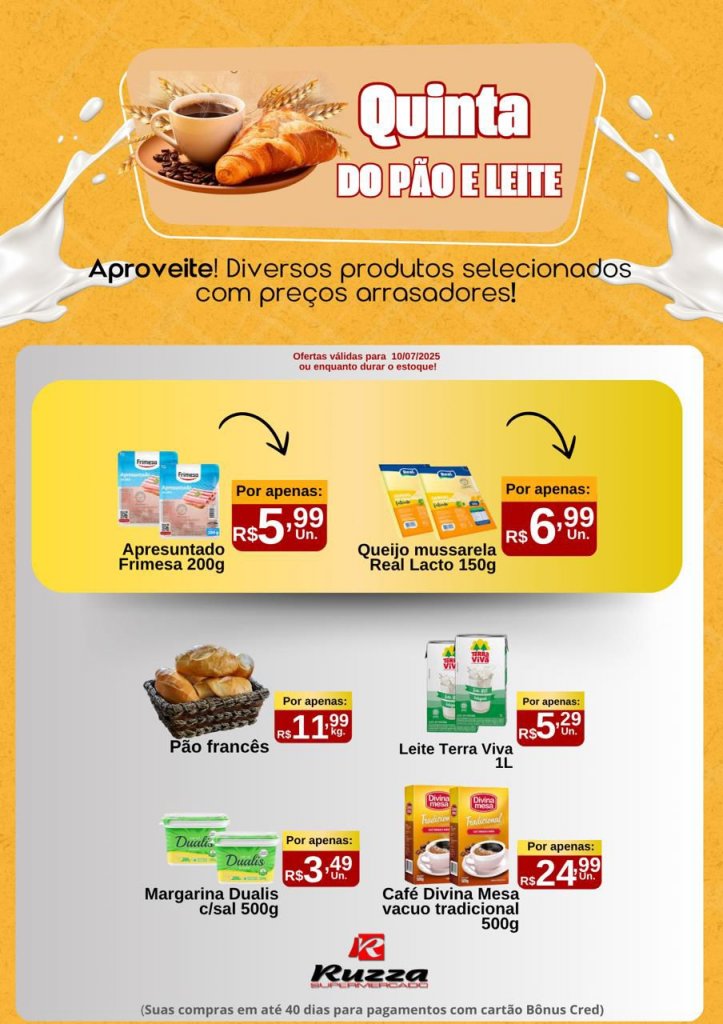 O Supermercado Ruzza preparou ofertas especiais para você, nesta quinta (10), venha e aproveite a Quinta do Pão e do Leite.