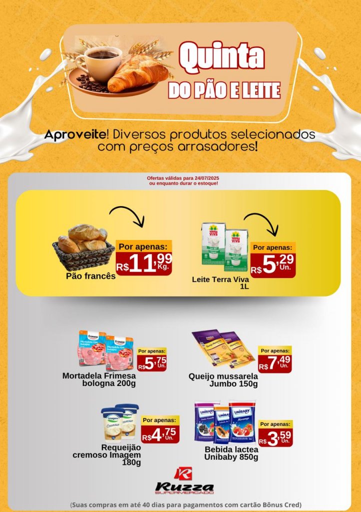O Supermercado Ruzza preparou ofertas especiais para você, nesta quinta (24), venha e aproveite a Quinta do Pão e do Leite.