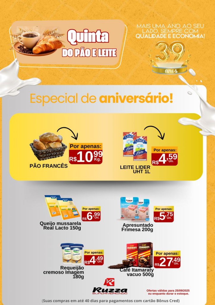 O Supermercado Ruzza preparou ofertas especiais para você, nesta quinta (25), venha e aproveite a Quinta do Pão e do Leite.