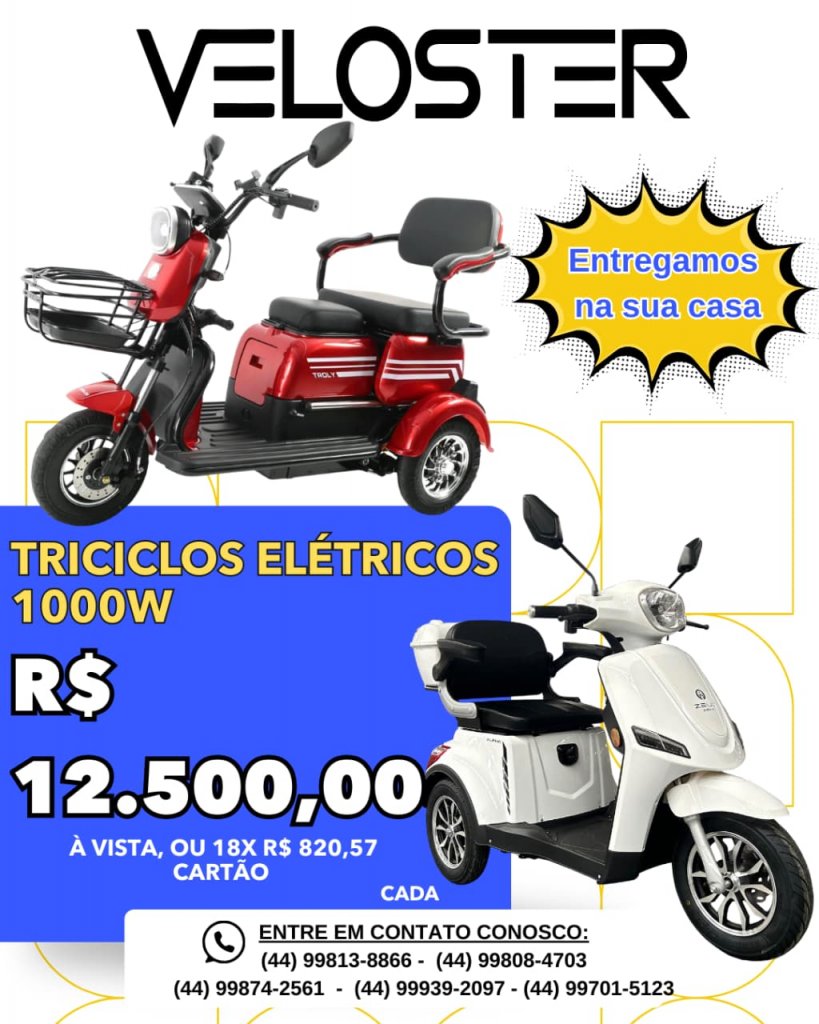 A Veloster Palotina apresenta os triciclos elétricos de 1000W, uma opção moderna e sustentável para quem busca mobilidade com segurança, economia e praticidade no dia a dia. Os modelos unem design inovador, conforto e desempenho, sendo ideais para deslocamentos curtos e médios, além de facilitarem a rotina de quem valoriza eficiência e qualidade.