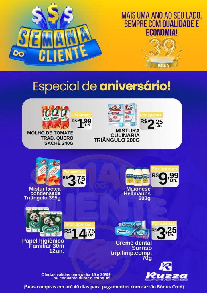 O Supermercado Ruzza completa 39 anos de história ao lado dos clientes e preparou ofertas imperdíveis para celebrar a data. Mais de três décadas de tradição, confiança e parceria com a comunidade são comemoradas com promoções que unem qualidade, economia e bom atendimento.