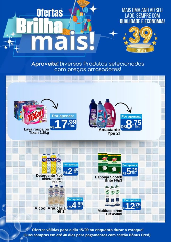 A campanha Semana do Cliente, válida de 15 e 20 de setembro, traz descontos exclusivos em diversos setores, garantindo vantagens para toda a família. Já a ação Ofertas Brilha Mais, válida somente hoje (15), destaca itens de limpeza com preços especiais, reforçando praticidade e variedade.