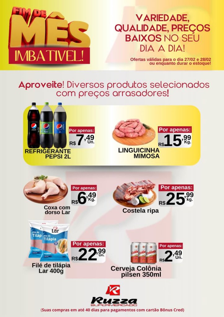 O momento de economizar chegou! No Fim de Mês Imbatível, o Supermercado Ruzza traz descontos especiais em produtos selecionados para você aproveitar o melhor sem pesar no bolso.