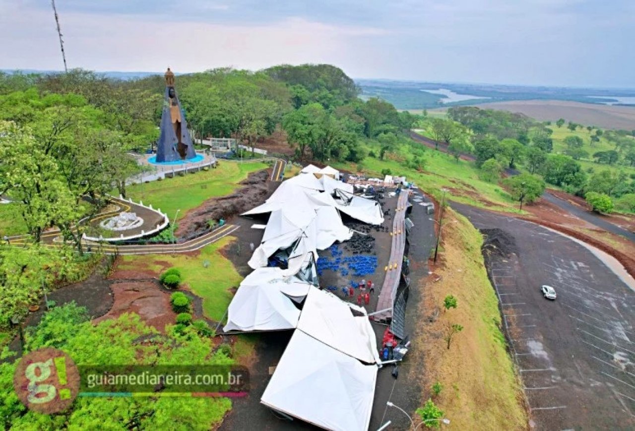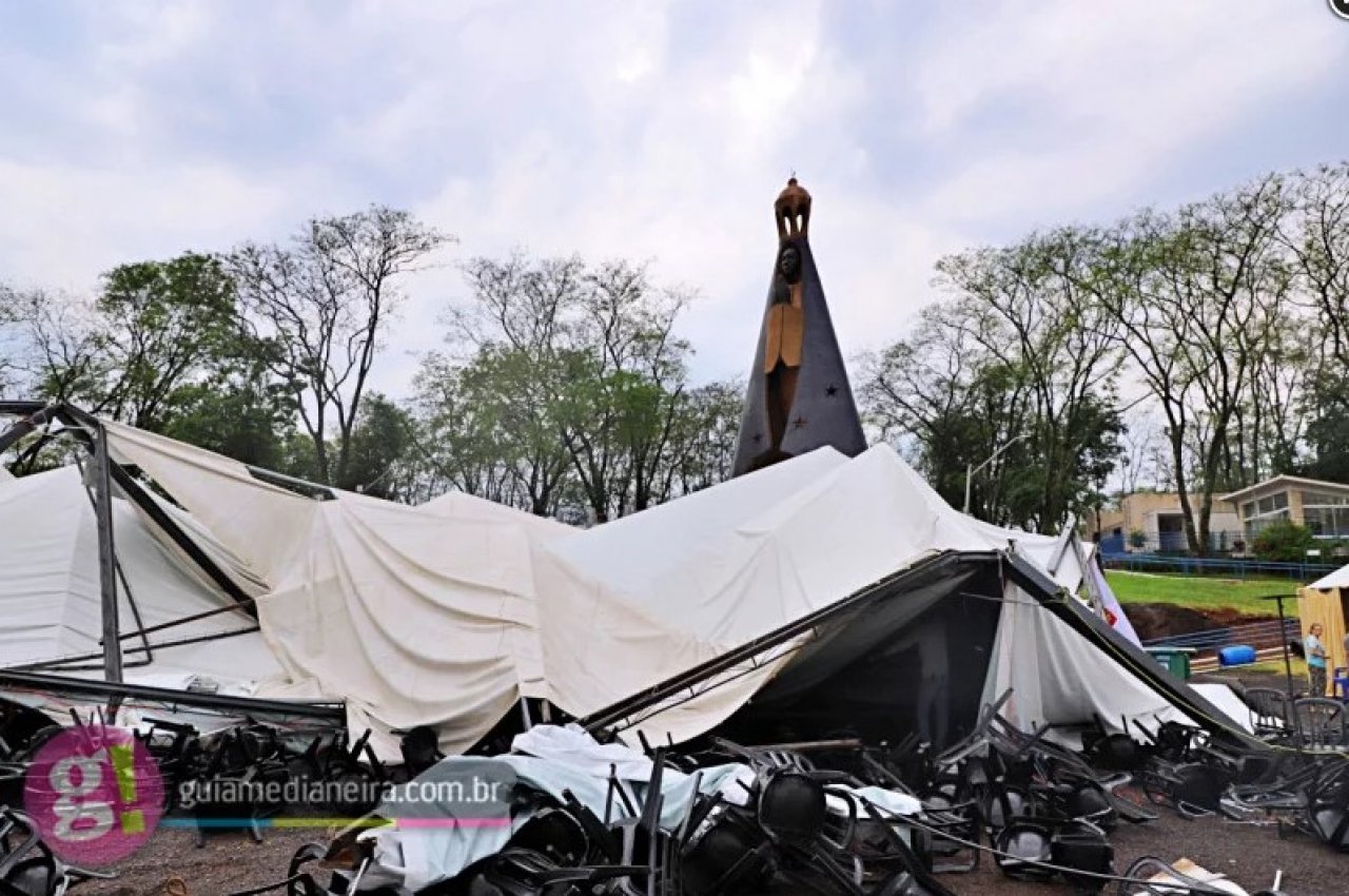 O turismo religioso itaipulandiense amanheceu abalado. Isto porque a cidade enfrentou um forte temporal na madrugada de quarta-feira (04), que causou sérios danos à estrutura montada para receber romeiros e turistas durante as celebrações da Semana da Padroeira, no Monumento Nossa Senhora Aparecida. Os ventos chegaram a 60 km/h.