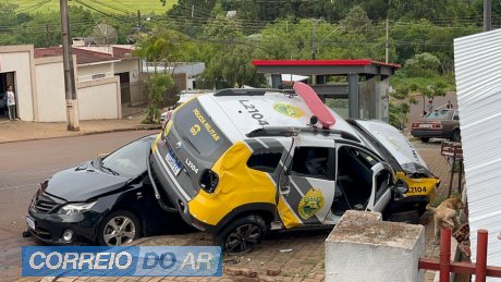 Uma viatura da Polícia Militar atingiu um carro, ponto de ônibus e a entrada de uma casa no bairro Interlagos em Cascavel, na tarde desta quinta-feira (13).