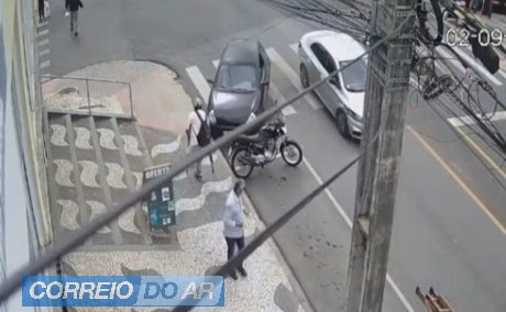 Com o impacto, o carro preto perdeu o controle, subiu na calçada, atingiu uma motocicleta estacionada e acabou atropelando o pedestre, que foi lançado sobre o capô e em seguida caiu no chão.